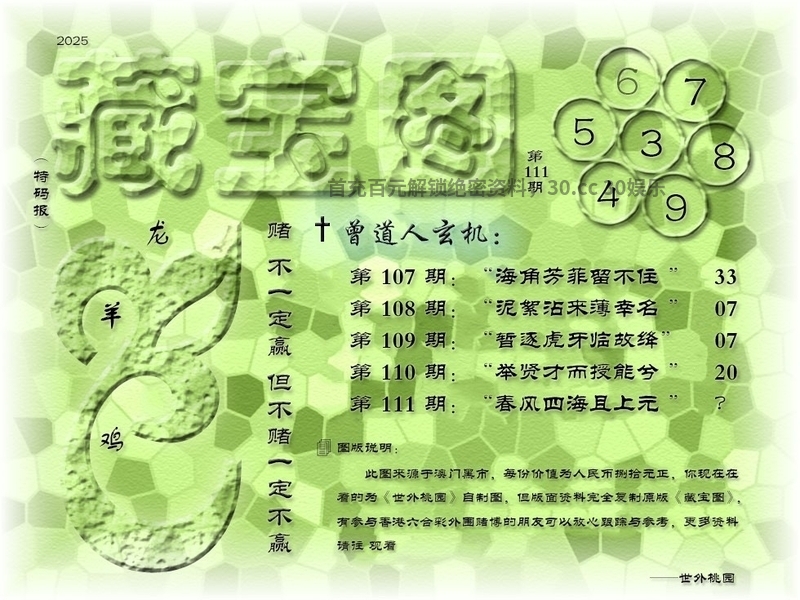 111期藏宝图:【春风四海且上元】 浅解:春风四海且上元,解春肖虎兔龙 综合解肖:牛猪猴马蛇虎鼠龙鸡 |